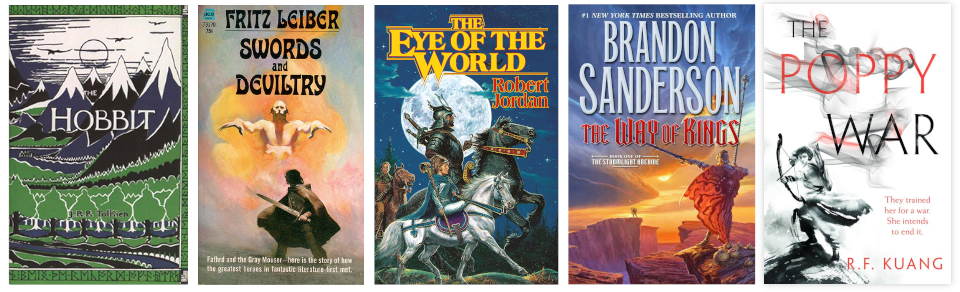 Again, I’d argue that the best example of a genre is the first one, and in this case that is The Hobbit (1937) by J.R.R. Tolkien. Other wonderful examples of high fantasy include Swords and Deviltry (1970) by Fritz Leiber, The Eye of the World (1990) by Robert Jordan, The Way of Kings (2010) by Brandon Sanderson, and The Poppy War (2018) by R.F. Kuang.