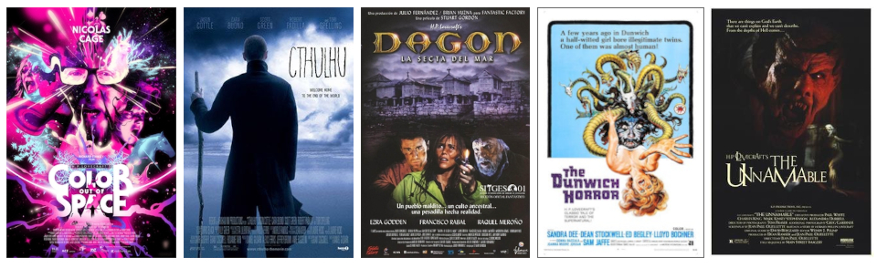 A great number of films have either been direct adaptations of Lovecraft’s writings or inspired by them. A few examples of most direct influences are Color out of Space (2019), Cthulhu (2007), Dagon (2001), The Dunwich Horror (1970), and The Unnamable (1988).